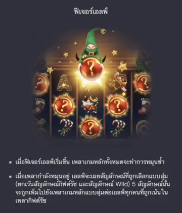 • เมื่อเพลากำลังหมุนอยู่ เอลฟ์จะเผยสัญลักษณ์ที่ถูกเลือกแบบสุ่ม ยกเว้นสัญลักษณ์ กิฟต์ครัช และสัญลักษณ์ Wild 5 สัญลักษณ์นั้นจะถูกเพิ่มไปยังเพลาเกมหลักแบบสุ่มต่อเอลฟ์ทุกคนที่ถูกเน้นในเพลากิฟต์รัช
